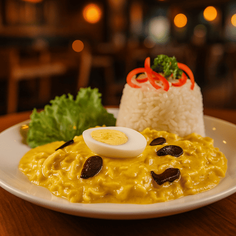 Pollo deshilachado con salsa huancaína, acompañado de arroz.