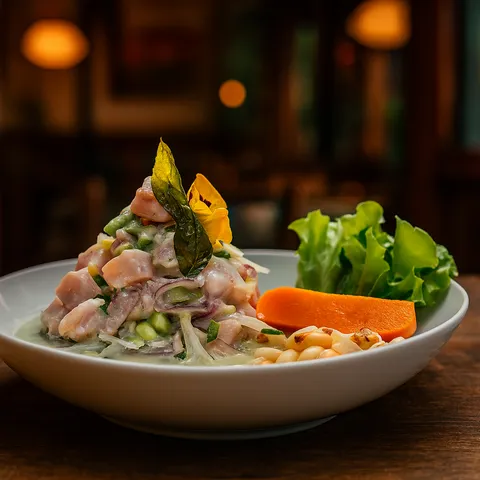 Nuestro famoso ceviche clásico, con cubitos de la mejor palta chilena.