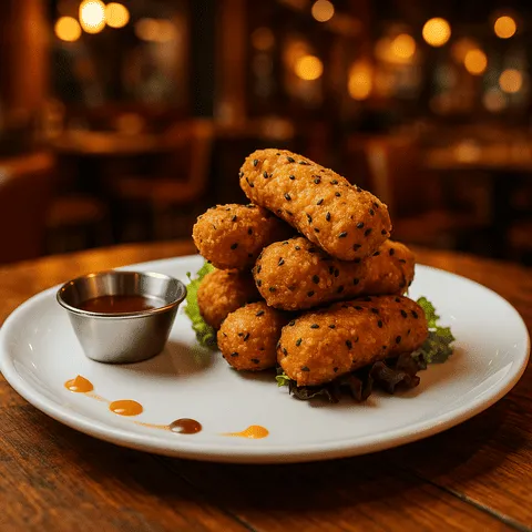 Tiernos bastoncitos de pollo rebozados en panko, freídos a la perfección, acompañado con salsa sriracha.