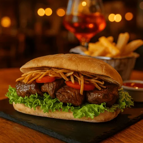 Nuestro clásico de puro filete llevado al sandwich, acompañado con papas fritas.