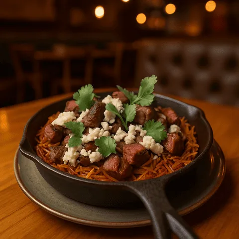 Fideos sofritos en manteca y fondo de res, con un toque de tomate y orégano, ahumados a las brasas, con lomo vetado a la parrilla, queso fresco y ramilletes de cilantro.