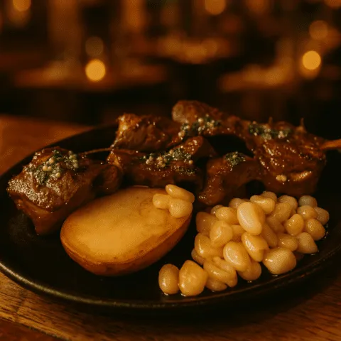 Brochetas de tiernas laminas de corazón de vacuno, con chimichurri, acompañadas de choclo peruano y papas asadas.
