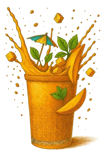 Pulpa de mango, pulpa de maracuyá, soda sabor lima-limón, escarchado de mango, decorado con rodaja de mango y hojas de menta.