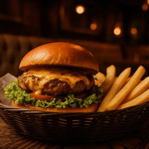Hamburguesa casera, queso cheddar, lechuga, tomate, acompañada con papas fritas y mini jugo.