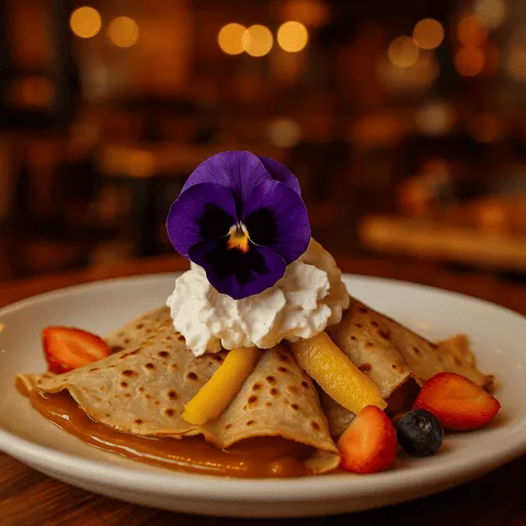 Panqueques rellenos de dulce de leche con crema y frutas de estación.