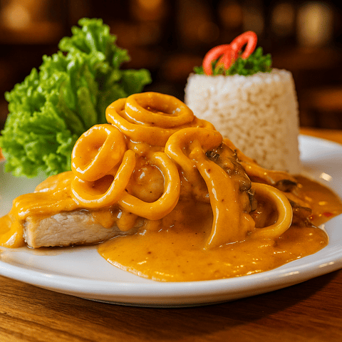 Pesca del día con salsa a lo macho acompañado con arroz.