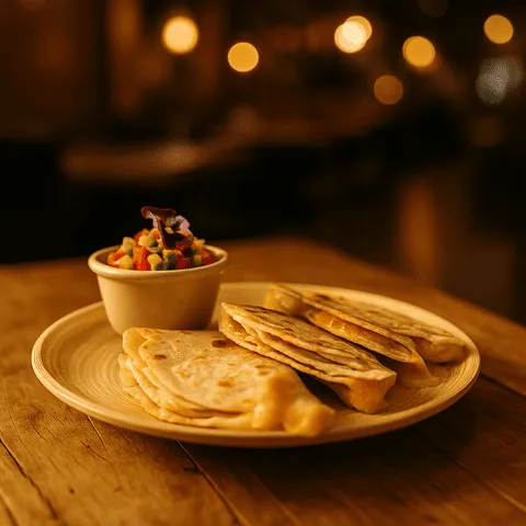 Cuatro tortillas de harina de trigo rellenas de queso mantecoso y cheddar acompañadas con pico de gallo y guacamole.
